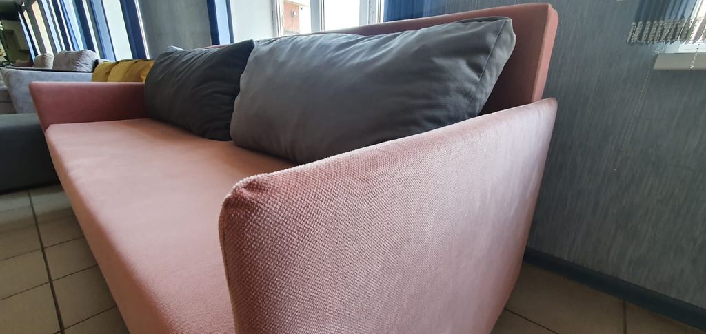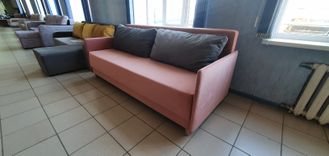 Особенность дивана – тонкие подлокотники. Такое решение призвано экономить жилое пространство. Обладая скромными габаритными размерами, диван располагает полноценным спальным местом для двоих. Комфортность посадки и спального места обеспечиваются объёмными подушками спинки.