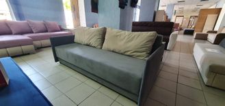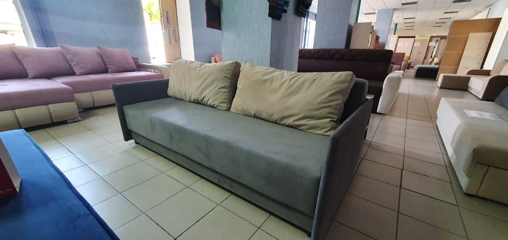 Особенность дивана – тонкие подлокотники. Такое решение призвано экономить жилое пространство. Обладая скромными габаритными размерами, диван располагает полноценным спальным местом для двоих. Комфортность посадки и спального места обеспечиваются объёмными подушками спинки.